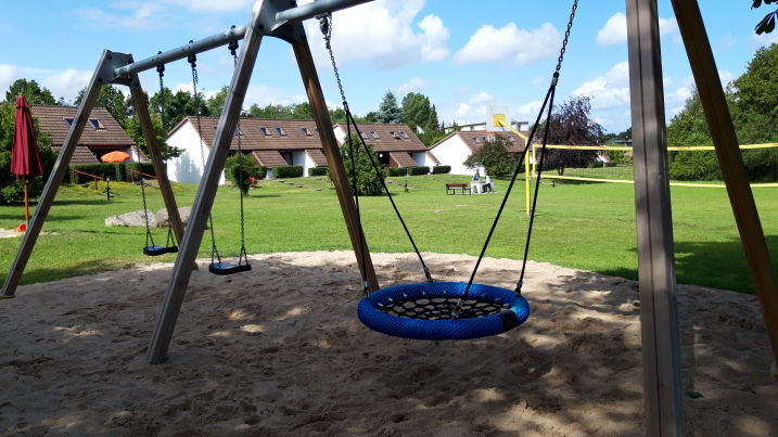 Spielwiese für Kinder mit Schaukel, Sandkiste, Reck, Tischtennisplatten, Volleyballfeld, Basketballkorb, Torwand, Kicker
