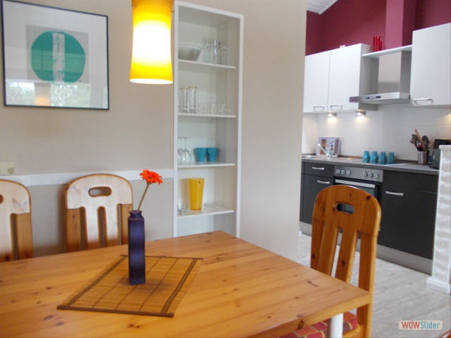 Im Erdgeschoß finden Sie eine offene Küchenzeile mit Essecke, eine Sitzgruppe, einen 2-Bett Schlafraum mit großem Wandschrank und ein kleines Duschbad.